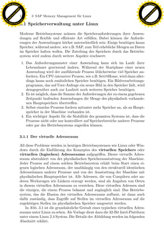 Das Dokument behandelt das Speichermanagement von SAP unter Linux und erklärt die allgemeinen Konzepte der Linux-Speicherverwaltung sowie die spezifischen Anforderungen und Strukturen des SAP-Systems. Es werden sowohl das Standardverfahren als auch ein Linux-spezifisches Verfahren zur Verwaltung des virtuellen Adressraums behandelt, sowie Probleme der Speicherverknappung auf 32-Bit-Plattformen und Änderungen im Linux-Kernel 2.6. Der Text schließt mit Hinweisen auf Werkzeuge zur Diagnose und Beobachtung des Speichermanagements.