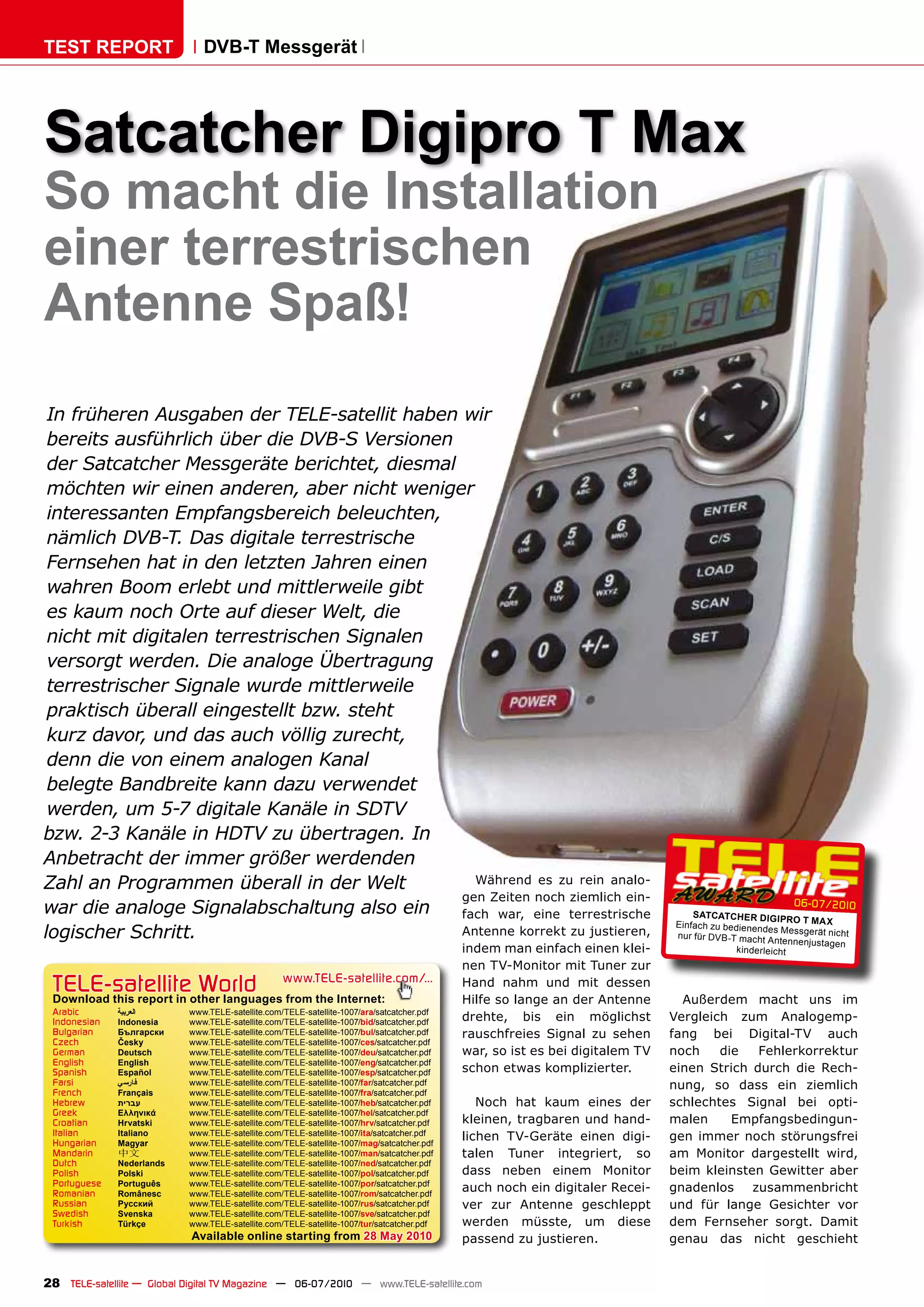 Der Testbericht des Satcatcher Digipro T Max beschreibt, wie einfach die Installation und Justierung einer DVB-T Antenne ist, insbesondere durch die Verwendung des benutzerfreundlichen Messgeräts, das digitale terrestrische Fernsehsignale unterstützt. Das Messgerät bietet verschiedene Funktionen wie Signalstärkeanalysen, Spektrumanzeigen und die Möglichkeit, Frequenzlisten zu speichern und zu verwalten. Der Test hebt auch die gute Verarbeitungsqualität, die gebotene Stabilität sowie den praktischen Nutzen des Digipro T Max für professionelle Monteure hervor.