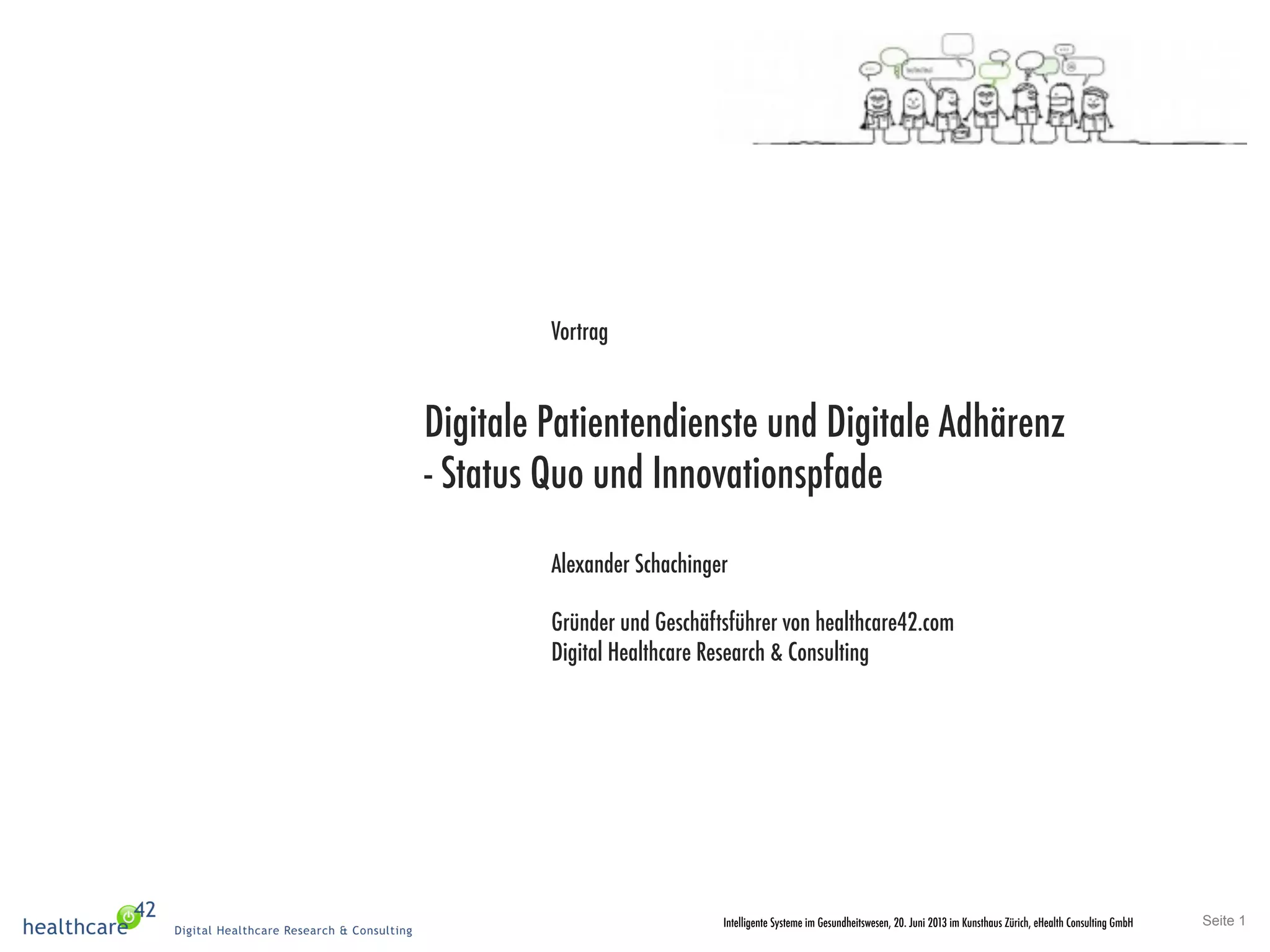 Das Dokument behandelt den Vortrag über digitale Patientendienste und digitale Adhärenz im Gesundheitswesen, gehalten von Alexander Schachinger. Es werden neue Regeln einer digitalen Netzwerkgesellschaft, Innovationspfade im Bereich Health 2.0 und der Fokus auf digitale Adhärenz thematisiert, wobei die Relevanz dieser Themen für die Gesundheitsversorgung in Deutschland hervorgehoben wird. Zudem wird auf die Bedeutung von e-Patienten und deren Einfluss auf die Arzt-Patienten-Kommunikation sowie die Notwendigkeit für eine optimierte Mediaplanung eingegangen.