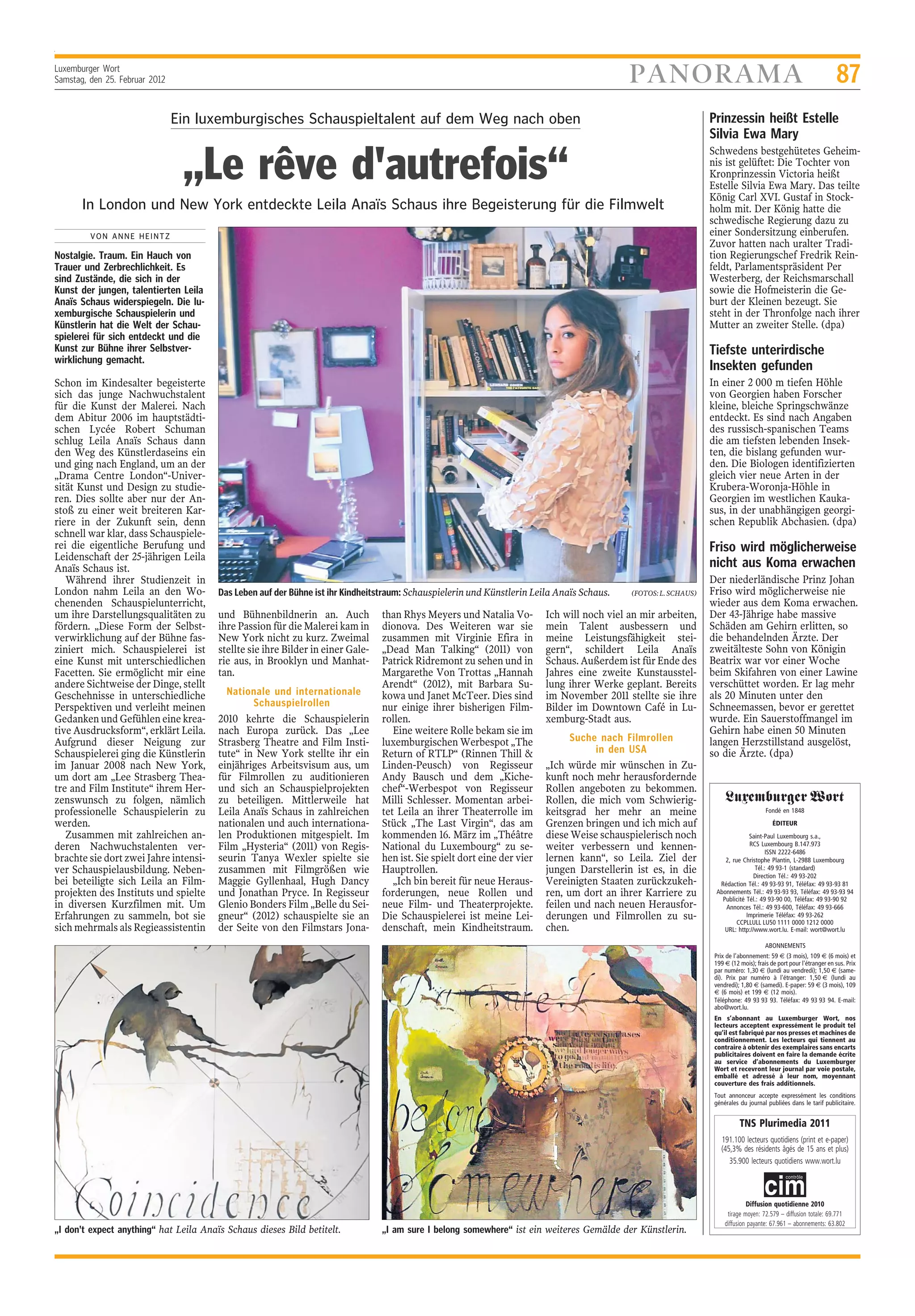 Leila Anaïs Schaus, ein aufstrebendes luxemburgisches Schauspieltalent, hat sich für die Schauspielerei und die Malerei begeistert. Nach ihrem Abitur und einem Studium in London zieht sie nun in die USA, um professionelle Schauspielrollen anzustreben. Ihre Leidenschaft für die Kunst spiegelt sich in ihren vielfältigen Projekten wider, und sie plant, weiterhin an anspruchsvollen Rollen zu arbeiten.