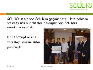 Sculio ist ein von Schülern gegründetes Unternehmen, das Vorteile für Schüler bei regionalen Partnern bietet, wie z.B. Rabatte auf Frisuren und ermäßigten Eintritt in Diskotheken. Die Mitgliedschaft kostet einmalig 3€ und ermöglicht den Zugang zu verschiedenen Angeboten ohne zusätzliche Kosten. Informationen über die Partner und Angebote sind auf der Homepage von sculio verfügbar.