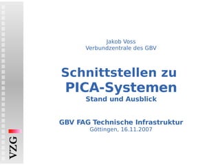 Das Dokument befasst sich mit dem Thema Schnittstellen zu PICA-Systemen im Kontext eines serviceorientierten Informationssystems, das eine flexible und transparente Nutzung von Bibliotheksdiensten ermöglicht. Es werden verschiedene Schnittstellenstandards wie Z39.50, SRU und OAI diskutiert, die für die Katalogisierung und Datenabfragen verwendet werden. Zudem werden Anwendungsbeispiele und Entwicklungen zur Implementierung von Webservices und APIs zur Optimierung der Bibliotheksservices vorgestellt.