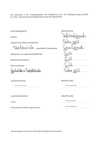 Das Dokument ist ein Reifeprüfungszeugnis der Bundeshandelsakademie und Bundeshandelsschule Wörgl, das die bestandenen Prüfungen und die Gesamtnote der Schüler bescheinigt. Es enthält Informationen über die Prüfungsgebiete, Beurteilungsstufen sowie den Lehrplan der Akademie. Zudem wird die Erlangung der Berechtigungen für den Besuch einer Hochschule gemäß der relevanten Verordnungen bestätigt.
