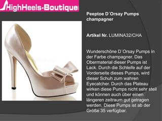 Das Dokument beschreibt eine Vielzahl von eleganten Schuhen, einschließlich D'Orsay-Pumps, Ankle Strap Sandaletten und Plateau-Pumps in verschiedenen Farben und Materialien. Alle Schuhe sind ab Größe 35 erhältlich und zeichnen sich durch auffällige Designelemente wie Schleifen und Plateau aus, die nicht nur stilvoll, sondern auch komfortabel sind. Die Modelle sind sowohl für Freizeit als auch für formelle Anlässe geeignet und bieten optimalen Halt und Tragekomfort.