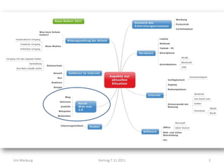 Der Vortrag an der Universität Marburg thematisiert den demografischen Wandel und die Veränderungen in der Medienlandschaft, insbesondere die Nutzung von Web 2.0 durch die Bevölkerung. Es wird betont, dass die schulische Bildung kreative, kritische und produktive Kompetenzen fördern sollte, um Schüler auf die modernen Medien und deren Einsatz im Unterricht vorzubereiten. Ein Fokus liegt auf der Entwicklung von Medienkompetenz und der praktischen Anwendung von digitalen Medien im Bildungskontext.