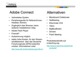 Das Dokument beschreibt die Nutzung von Adobe Connect für Online-Events, einschließlich Alternativen und technischen Anforderungen. Verschiedene Aspekte der Veranstaltungsorganisation, Durchführung und Nachbearbeitung werden behandelt, ebenso wie die Bereitstellung von Informationen und Hilfestellungen. Ein Hinweis auf kommende Veranstaltungen und Schulungen im Bereich E-Teaching wird ebenfalls gegeben.