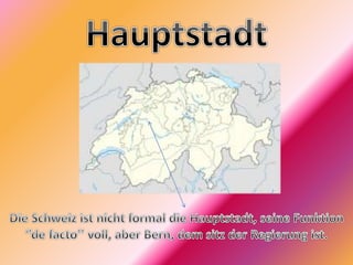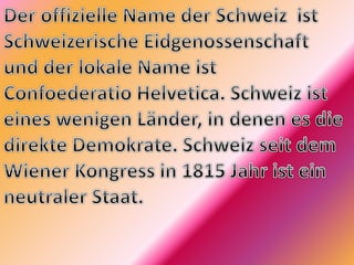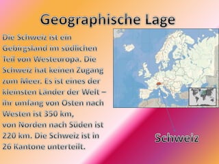 Das Dokument bietet eine umfassende Darstellung der Schweiz, einschließlich ihrer wichtigsten Städte wie Zürich, Genf, Basel, Lausanne und Bern, sowie Informationen zu Flüssen, Seen, Bergen und der politischen Struktur des Landes. Es erwähnt auch bedeutende Persönlichkeiten, kulturelle Merkmale, sowie die Wirtschaft, insbesondere in Bezug auf Banken und Industrie. Darüber hinaus werden Themen wie Mehrsprachigkeit und Religion in der Schweiz angesprochen.