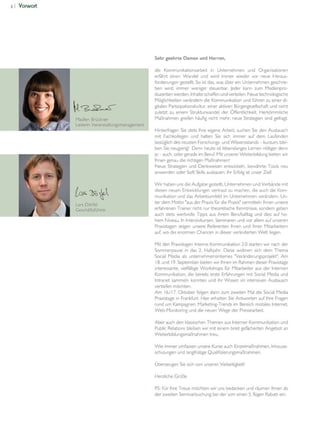 Das Dokument beschreibt ein umfassendes Weiterbildungsangebot im Bereich der internen Kommunikation und Public Relations, das verschiedene Seminare, Intensivkurse und Praxistage umfasst. Es wird betont, dass kontinuierliche Weiterbildung und der Austausch mit Experten entscheidend sind, um Führungskräfte auf zukünftige Herausforderungen vorzubereiten und ihre Kommunikationsfähigkeiten zu verbessern. Außerdem wird die Integration von Social Media in die interne Kommunikation thematisiert, um Wissensmanagement und Zusammenarbeit zu optimieren.