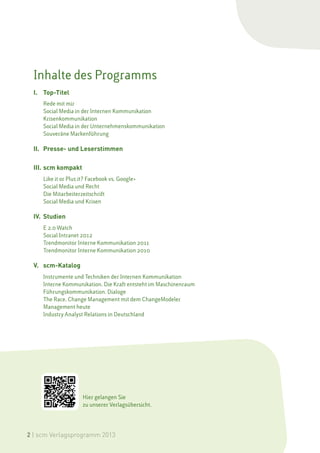 Das Verlagsprogramm 2013 des SCM thematisiert interne Kommunikation, Social Media und Pressearbeit und bietet eine Vielzahl von Fachbüchern, die sich mit dem Wissenstransfer und der Nutzung von Social Media in Unternehmen beschäftigen. Wichtige Titel beinhalten "Rede mit mir", das die Kluft zwischen Theorie und Praxis der internen Kommunikation untersucht, sowie "Social Media in der internen Kommunikation", das praxisnahe Ansätze zur Implementierung liefert. Darüber hinaus werden Krisenkommunikation und souveräne Markenführung behandelt, wobei das Programm darauf abzielt, Unternehmen bei der effektiven Kommunikation und Markenführung im digitalen Zeitalter zu unterstützen.