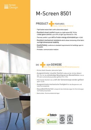 Das Dokument beschreibt verschiedene Produkte aus intelligenten Stoffen für den Sonnenschutz, insbesondere die M-Screen 8501, 8503 und 8505. Diese Gewebe bieten ausgezeichneten visuellem und thermischen Komfort, filtern bis zu 97% des Lichtes und sind in Breiten von bis zu 310 cm mit unterschiedlichen Openness-Faktoren erhältlich. Sie erfüllen die Sicherheitsstandards für öffentliche Gebäude und sind druckbar für Kommunikationszwecke.