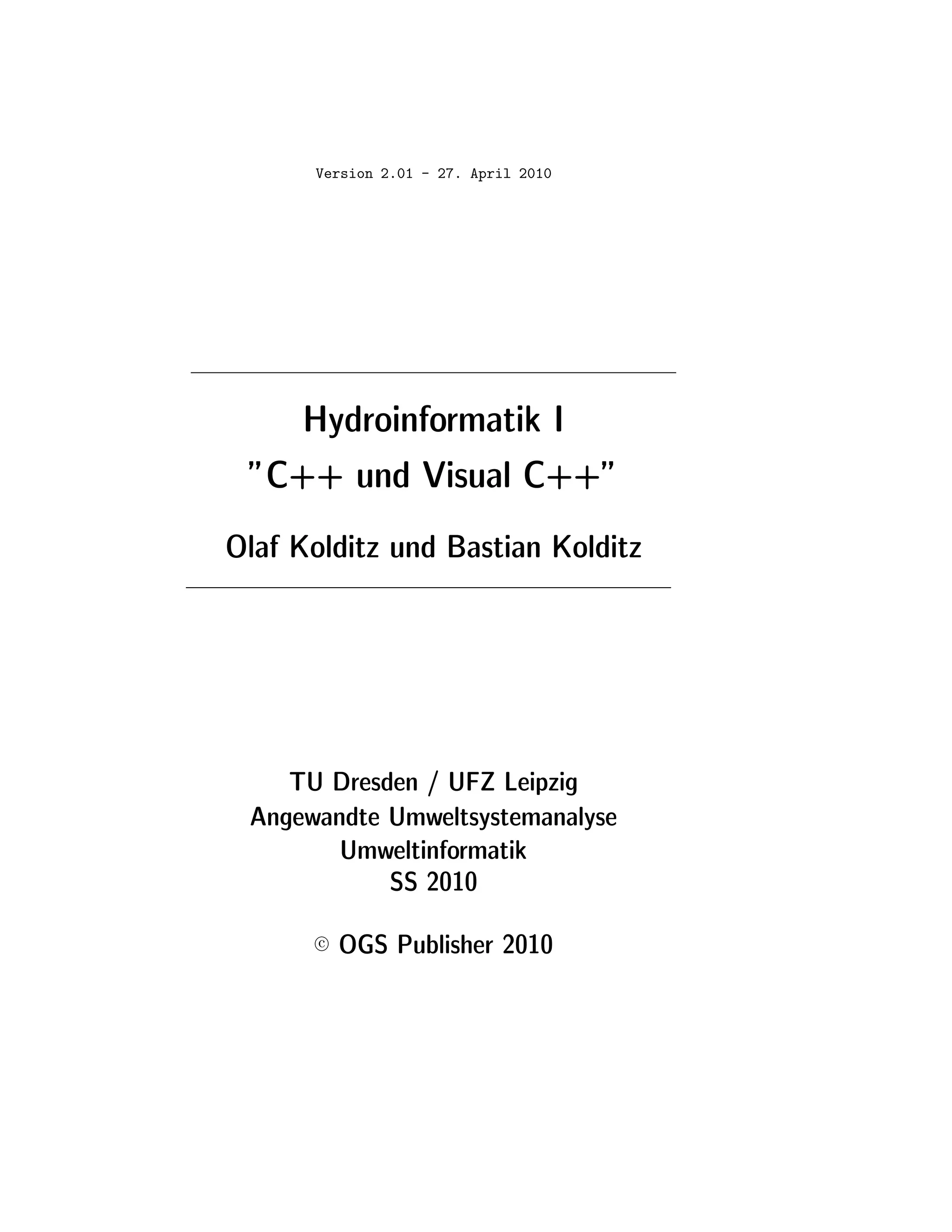 Das Dokument behandelt das Vorlesungskonzept für Hydroinformatik, das sich auf die Informationsverarbeitung in der Hydrologie konzentriert und die Programmiersprache C++ sowie deren Anwendung lehrt. Studenten lernen durch praktische Anwendung im Rahmen eines Projekts, um Datenbankanwendungen zu entwickeln und in grafischen Benutzeroberflächen (GUI) darzustellen. Die Vorlesung beinhaltet sowohl theoretische als auch praktische Elemente und stellt Ressourcen und Unterstützung für die Studierenden bereit.