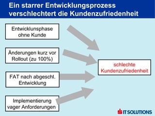 Unzufriedene Kunden führen zu einem negativen Unternehmensimage und der Verlust von Projekten. Eine Einbeziehung der Kunden in den Entwicklungsprozess sowie die Umstellung auf agile Methoden sind vorgeschlagene Maßnahmen zur Verbesserung der Kundenzufriedenheit und Projektergebnisse. Schulungen und Kommunikation sind erforderlich, um das Team und das Management von den Änderungen zu überzeugen.