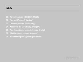 Das Dokument behandelt die Einführung von Scrum und Kanban im Agenturgeschäft und erörtert deren Grundlagen, Vorteile sowie Herausforderungen. Es werden Kriterien für die Wahl zwischen Scrum und Kanban sowie die erforderlichen Schritte zur erfolgreichen Implementierung erläutert, einschließlich der Bedeutung der Mitarbeitereinbindung und der kontinuierlichen Verbesserung. Zudem wird auf die Beziehung zu Kunden eingegangen, insbesondere hinsichtlich der Projektabwicklung bei unterschiedlichen Komplexitätsgraden.