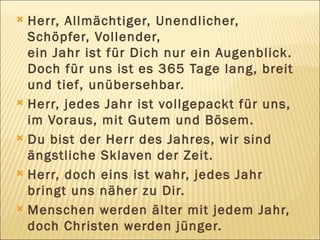 Das Dokument ist ein Gebet, das die Unterschiede zwischen der menschlichen Erfahrung von Zeit und Gottes Ewigkeit thematisiert. Es reflektiert über die Herausforderungen und Segnungen eines Jahres und betont die Bedeutung von Gnade und Vergebung. Der Bittende verbindet seine Bitte um Gesundheit und geistliches Wachstum mit der Hoffnung auf Gottes ständige Gegenwart.