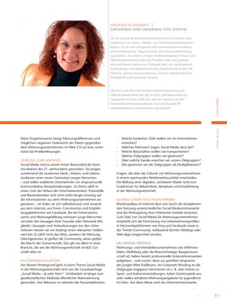 Das Dokument behandelt die Relevanz und den Nutzen von Social Media für die Wohnungswirtschaft, betont die Notwendigkeit eines zielgerichteten und professionellen Einsatzes dieser Kommunikationsmittel, und hebt hervor, dass Unternehmen in diesem Sektor ihre eigene Expertise und Erfahrung nutzen müssen. Es werden konkrete Ansätze und Strategien zur Implementierung von Social Media in der Unternehmenskommunikation vorgestellt, um die Kommunikation mit Mietern und anderen Zielgruppen zu verbessern und den Verlust der Informationshoheit entgegenzuwirken. Zudem wird auf die Wichtigkeit eingegangen, Transparenz und Dialogbereitschaft mit den Stakeholdern zu manifestieren, um Vertrauen und Bekanntheit aufzubauen.