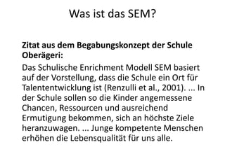Das Schulische Enrichment Modell (SEM) ist ein Konzept zur Talenterwicklung, das von Joe Renzulli entwickelt wurde und weltweit in verschiedenen Ländern verbreitet ist. Es betrachtet Begabung als einen dynamischen Prozess und ermutigt Schulen, individuelle Förderprogramme zu entwickeln, um Schüler in ihrer talentfördernden Entwicklung zu unterstützen. Ziel ist es, durch geeignete Ressourcen und Ermutigung eine hohe Lebensqualität zu schaffen und das Potenzial junger Menschen zu entfalten.