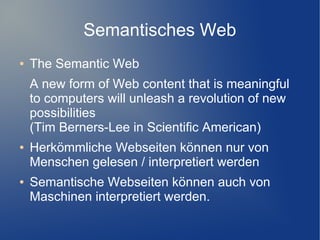 Das Dokument beschreibt das semantische Web als eine neue Form von Webinhalten, die sowohl von Menschen als auch von Maschinen interpretiert werden können, was neue Möglichkeiten eröffnet. Es erläutert die Bedeutung von Technologien wie RDF, SPARQL und Linked Data und veranschaulicht den Unterschied zwischen nicht-semantischen und semantischen Webseiten. Zudem wird das Resource Description Framework (RDF) als Modell zur Beschreibung von Ressourcen und deren Beziehungen sowie die Verwendung von SPARQL als Abfragesprache für RDF-Daten hervorgehoben.