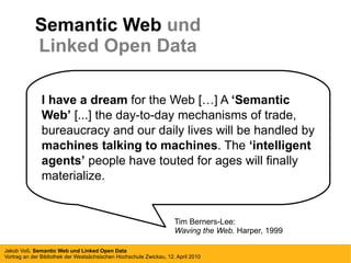 Das Dokument behandelt das Konzept des Semantic Web und Linked Open Data, das die Vernetzung und Verfügbarkeit strukturierter Daten durch maschinenlesbare Formate und Standards wie RDF ermöglicht. Dabei wird die Entwicklung und Geschichte der Datenspeicherung sowie die Nutzung von eindeutigen Identifikatoren und URIs hervorgehoben. Der Schlüssel zur Umsetzung liegt in der Verknüpfung von Daten und der Bereitstellung von offenen Daten durch Bibliotheken.