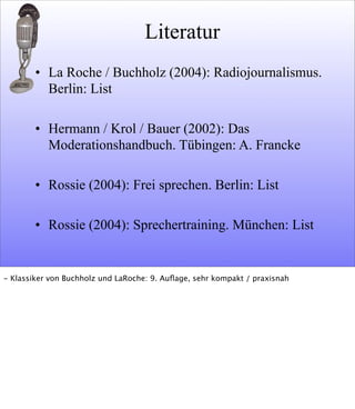 Das Dokument behandelt die Grundlagen des Radiojournalismus, insbesondere Moderation, Interviewführung und das freie Sprechen. Es umfasst praktische Tipps zur Gestaltung von Radiobeiträgen, die Bedeutung von Emotionen, die Planung von Interviews sowie verschiedene Fragetechniken. Außerdem wird das 'Topfsystem' als Methode vorgestellt, um Inhalte strukturiert und authentisch zu präsentieren.