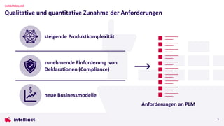 Das Dokument diskutiert die Entwicklung einer service-orientierten PLM-Architektur, die auf die steigenden Anforderungen durch Produktkomplexität und Compliance abzielt. Es beschreibt den Lösungsansatz eines PLM-Backbones, der verschiedene Unternehmensprozesse integriert, um eine effiziente Aufgabenverwaltung zu ermöglichen. Zudem werden wichtige Aspekte wie Skalierbarkeit, Integration und Nutzerbedürfnisse hervorgehoben, um die PLM-Komplexität zu kontrollieren.