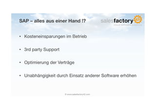 Das Dokument erläutert kundenorientierte Geschäftsprozesse mit einem Fokus auf den Einsatz von Salesforce, SAP und Google Enterprise, um Effizienz und Kostenersparnis zu erreichen. Es betont die Bedeutung von Mitarbeitermotivation, flexiblen Prozessen und Cloud-Technologien sowie die Integration von E-Mail-Systemen in CRM-Lösungen. Abschließend hebt es die Vorteile von SaaS und Cloud-Computing hervor, um innovative, agile und kundenorientierte Geschäftsprozesse zu unterstützen.