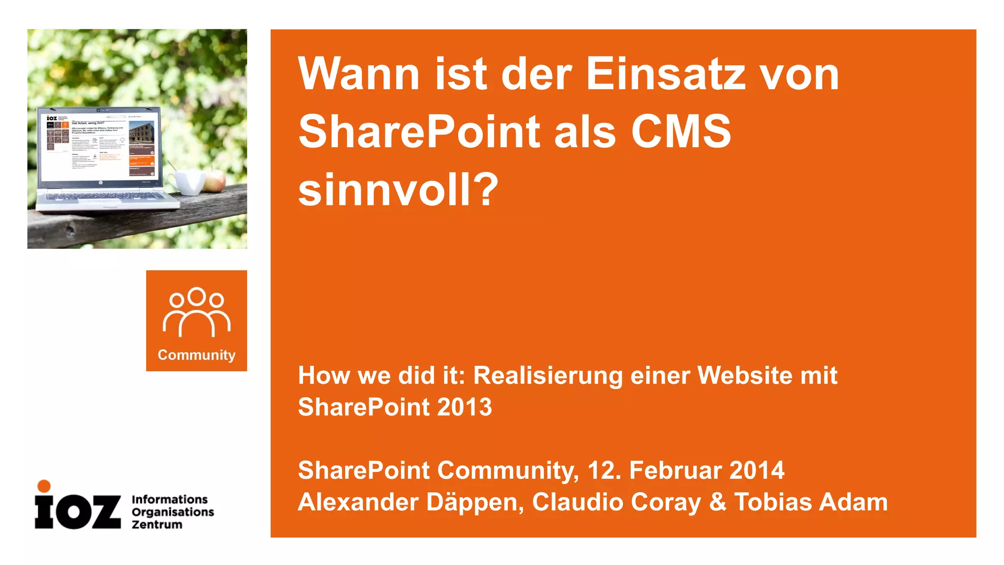 Das Dokument behandelt den Einsatz von SharePoint als Content Management System (CMS) zur Erstellung einer Website, wobei die IOZ eine veraltete Website neu gestaltet hat, um Inhalte zu modernisieren und strategische Bereiche zu integrieren. Der Vergleich mit anderen CMS zeigt, dass SharePoint vorteilhaft ist, wenn es bereits für Intranet-Funktionen verwendet wird, da bestehende Daten und Funktionalitäten genutzt werden können. Es werden auch Erfahrungen und Herausforderungen bei der Planung und Durchführung eines Webauftritts geteilt, wobei auf die Bedeutung klarer Zielsetzungen und eines durchdachten Konzepts hingewiesen wird.