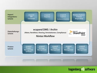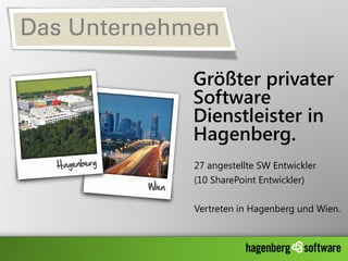 Das Dokument beschreibt die Nutzung von SharePoint als zentrales Enterprise Content Management und Prozessmanagement-Portal für das Unternehmen Hagenberg Software mit 27 Mitarbeitern. Es hebt die Vielseitigkeit von SharePoint hervor, einschließlich Dokumentenverwaltungen, Workflow-Management und Integration externer Partner, sowie die Vorteile für verschiedene Unternehmensgrößen. Es wird auch die Bedeutung der Prozessautomatisierung und der nahtlosen Integration in bestehende Systeme betont.