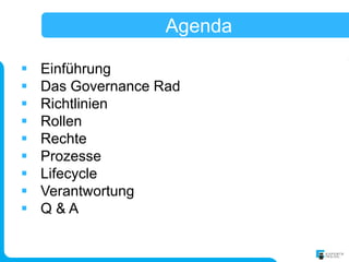 Das Dokument befasst sich mit der Governance von SharePoint und erläutert die Notwendigkeit von klaren Richtlinien, Rollen und Prozessen für eine effektive Nutzung. Samuel Zürcher, ein erfahrener Senior Consultant, betont die Risiken eines unstrukturierten Wachstums und die Wichtigkeit, Verantwortlichkeiten und Rechte im Rahmen von SharePoint festzulegen. Es werden grundlegende Fragen für die Nutzung von SharePoint sowie Beispiele für Rollen und Rechte in einer Projektumgebung vorgestellt.
