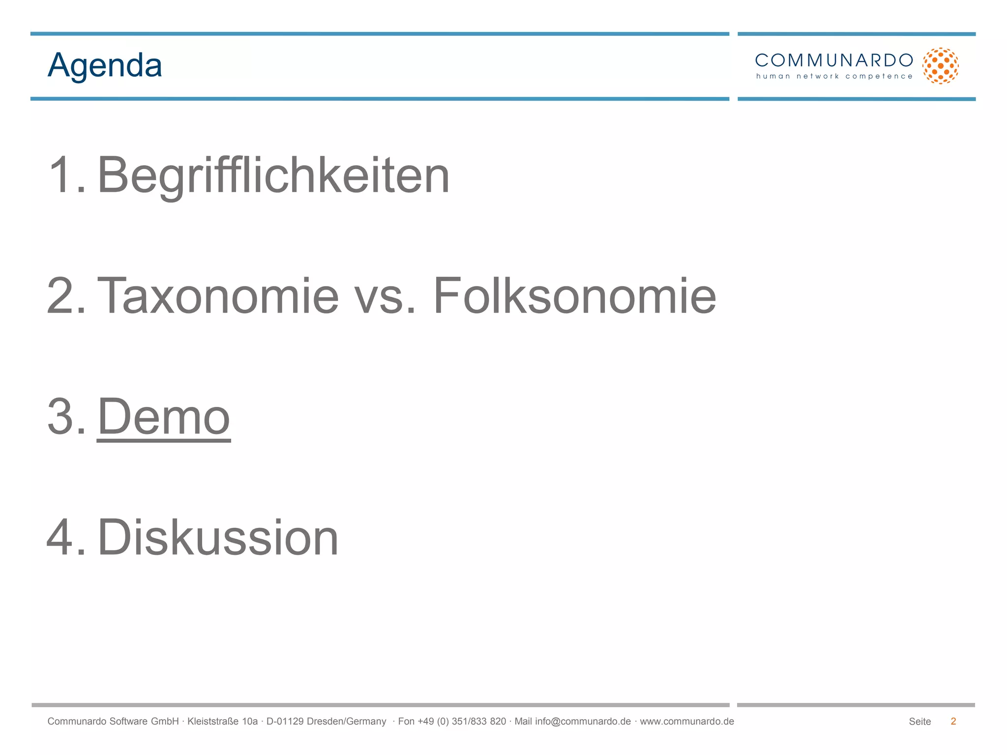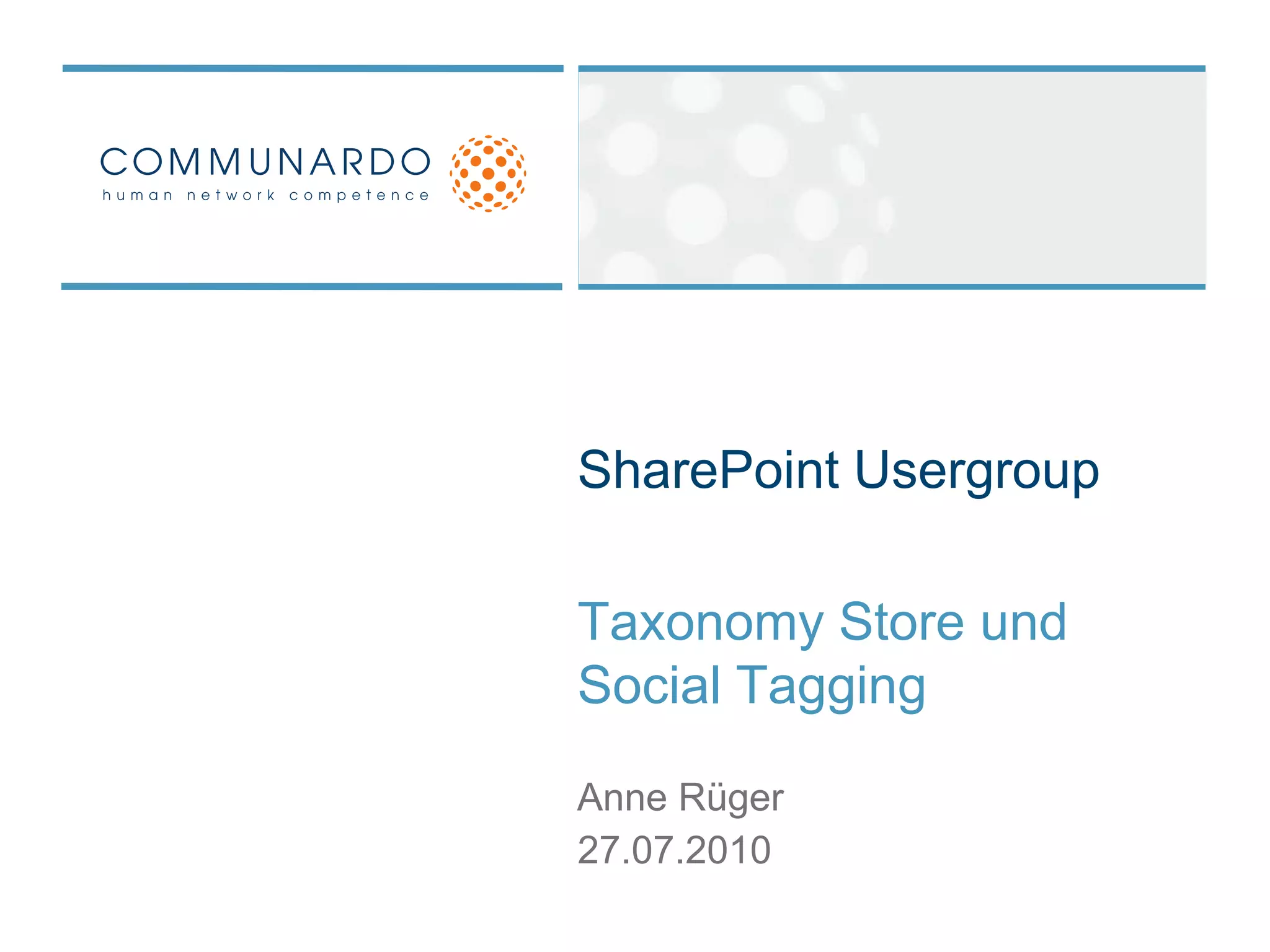 Das Dokument behandelt die Unterschiede zwischen Taxonomie und Folksonomie im Kontext von SharePoint, einschließlich grundlegender Begrifflichkeiten wie Term Store, Content Types und deren Management. Es diskutiert die Vor- und Nachteile beider Systeme hinsichtlich der Strukturierung und Nutzung von Metadaten. Zudem werden praktische Demonstrationen zu deren Implementierung und Nutzung in SharePoint vorgestellt.