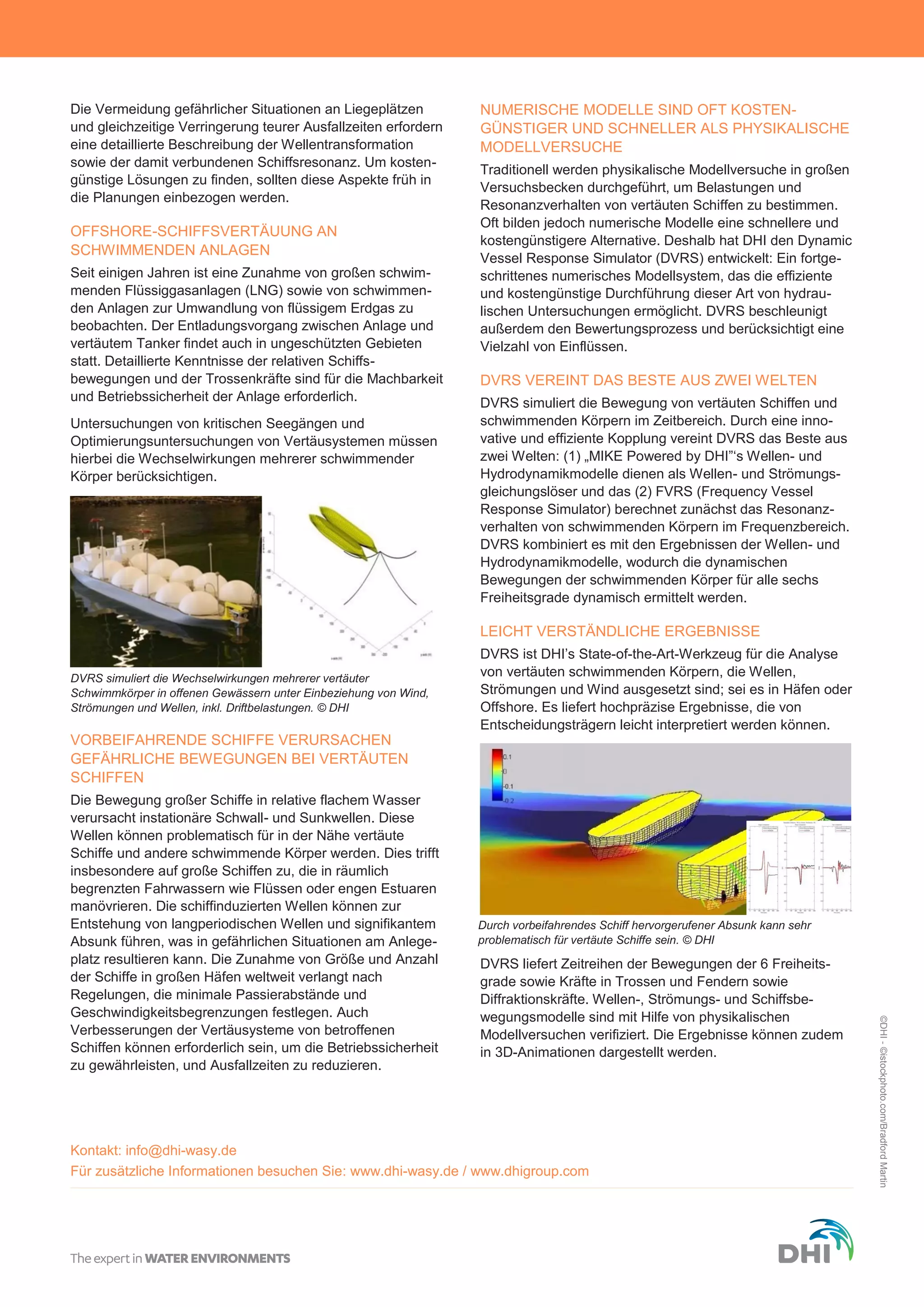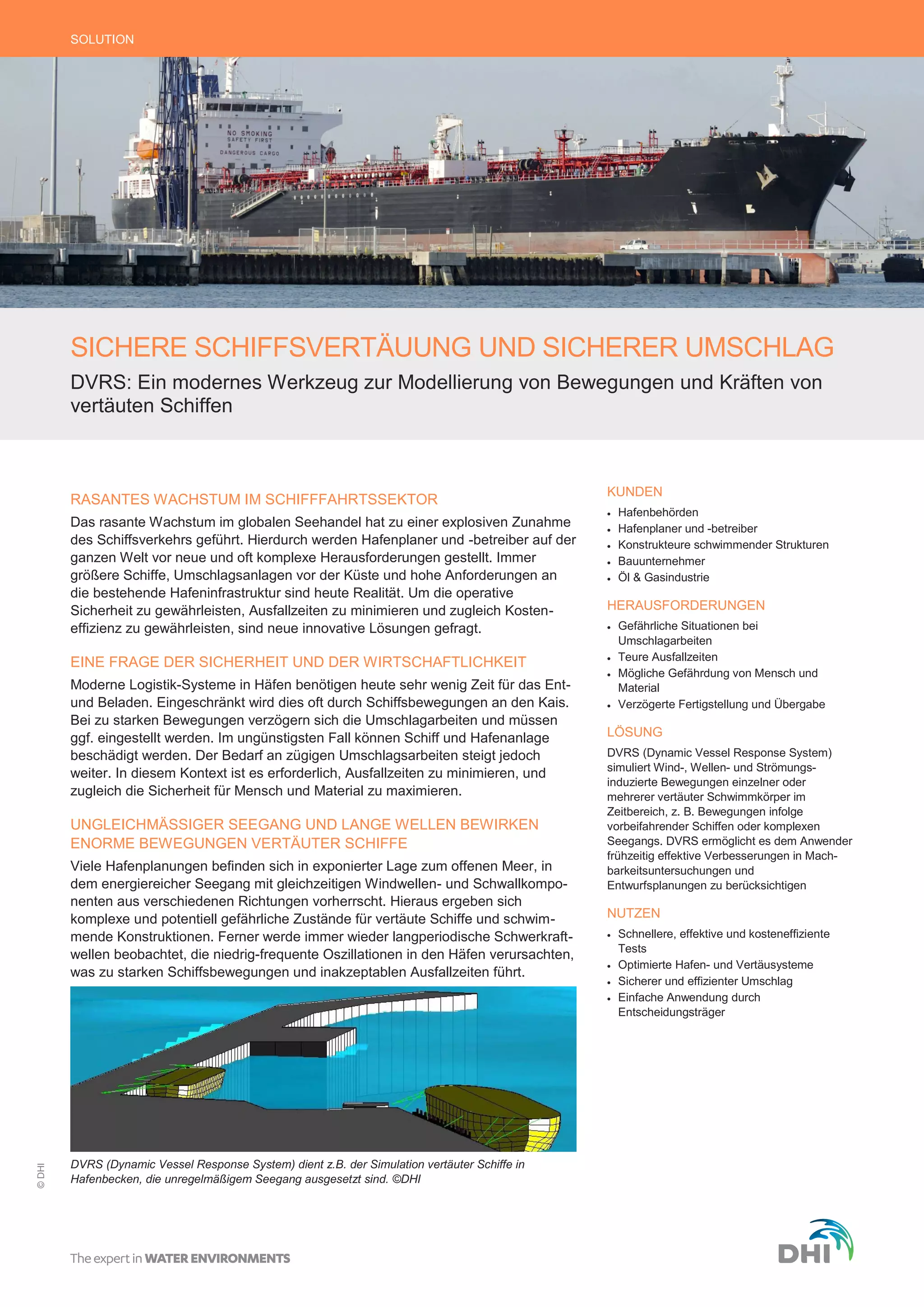 Das Dokument beschreibt das Dynamic Vessel Response System (DVRS), ein modernes Werkzeug zur Simulation der Bewegung und Kräfte von vertäuten Schiffen, das speziell auf die Herausforderungen im Hafenverkehr reagiert. Angesichts des zunehmenden Schiffsverkehrs und der damit verbundenen Betriebsrisiken bietet DVRS Lösungen zur Verbesserung der Sicherheit und Minimierung teurer Ausfallzeiten während des Umschlags. Das System kombiniert hydrodynamische Modelle und Resonanzverhalten, um präzise und interpretierbare Ergebnisse für Hafenplaner und Betreiber zu liefern.