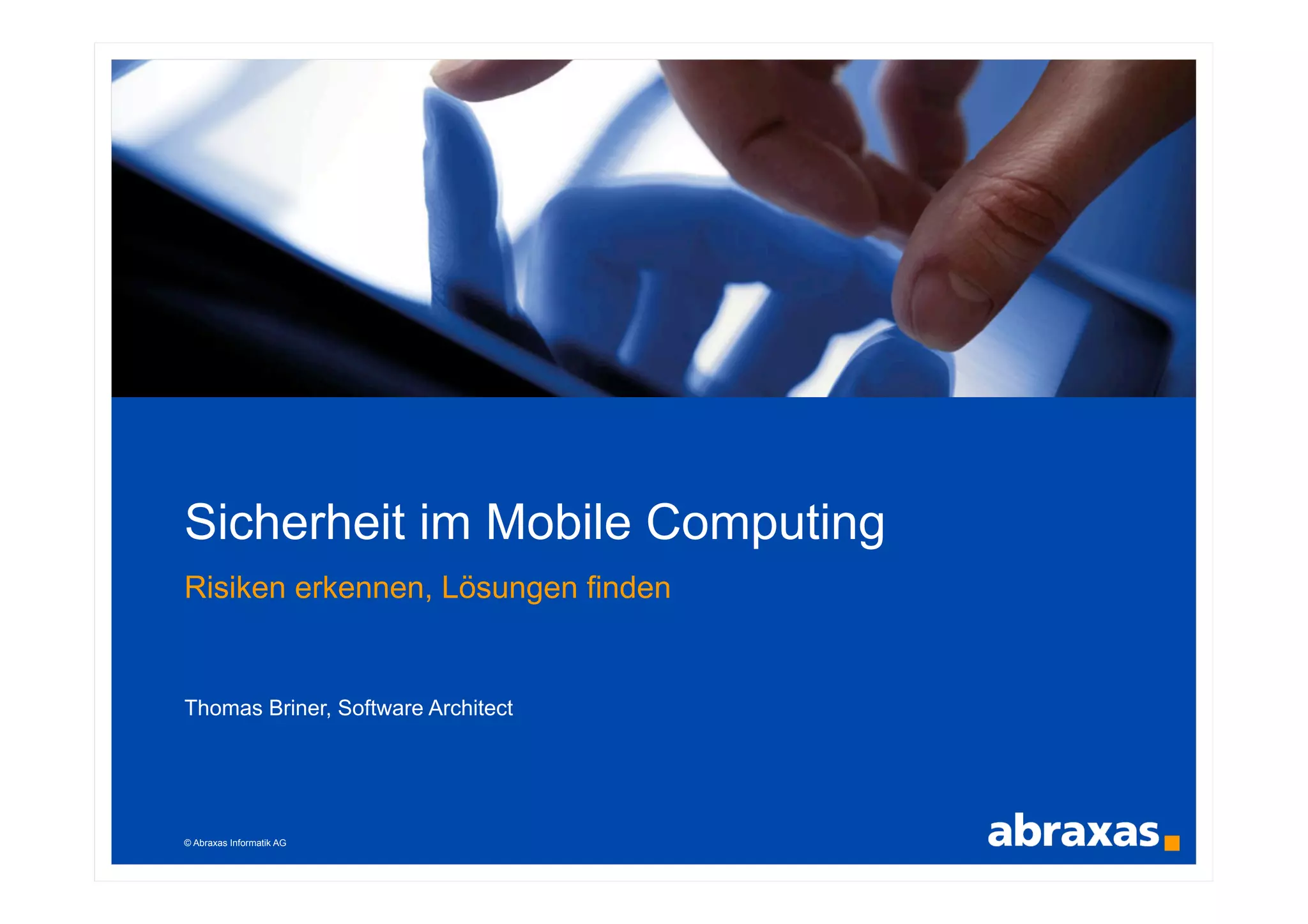 Das Dokument thematisiert die Sicherheitsrisiken im Mobile Computing, insbesondere im Vergleich zu stationären Lösungen, und bietet eine methodische Vorgehensweise zur Risikoanalyse und -bewältigung. Es werden zentrale Angriffspunkte wie Authentifizierung, Daten auf Geräten und Kommunikation angesprochen sowie das Zusammenspiel von Partnern zur Sicherheit mobiles Lösungen erläutert. Abschließend werden verschiedene Risikoarten und deren Eintrittswahrscheinlichkeiten vorgestellt, um ein umfassendes Verständnis für die Bedrohungen im Bereich Mobile Computing zu fördern.