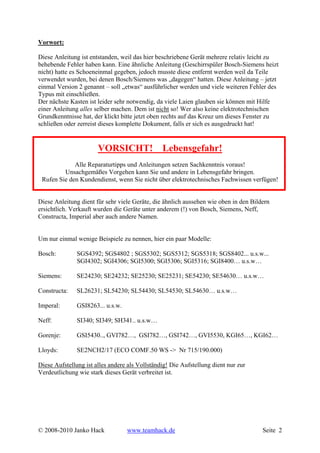 Die Reparaturanleitung für Bosch/Siemens Geschirrspüler bietet detaillierte Anweisungen zum Öffnen des Gerätes und zur Behebung häufiger Probleme, einschließlich Heizungs- und Abpumpfehlern. Sie enthält Sicherheitshinweise, um unsachgemäßes Vorgehen zu vermeiden, und beschreibt, wie man wichtige Komponenten wie Bedienblenden, Elektronik und Wartungsklappen zugänglich macht. Die Anleitung ist auf verschiedene Modelle anwendbar und richtet sich an Laien mit grundlegenden elektrotechnischen Kenntnissen.