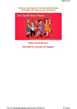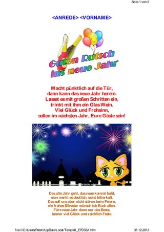 Das Dokument ist eine Silvesteransprache, die gute Wünsche für das neue Jahr 2013 übermittelt. Es ermutigt die Leser, das alte Jahr fröhlich abzuschließen und mit Freude und Glück in das neue Jahr zu starten. Der Autor wünscht den Lesern viel Glück und reichlich Feste im kommenden Jahr.