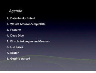 Amazon SimpleDB ist eine cloud-basierte, skalierbare und kostengünstige NoSQL-Datenbank, die Nutzern einen migrationsfreundlichen Übergang von SQL ermöglicht. Sie bietet ein flexibles Schema, automatische Skalierung und ist für eine Vielzahl von Anwendungsfällen geeignet, einschließlich mobiler Apps und Protokollierungen. Die Kostenstruktur ist nutzungsbasiert mit einer kostenlosen Einstiegsmöglichkeit und niedrigen Betriebskenntnissen.