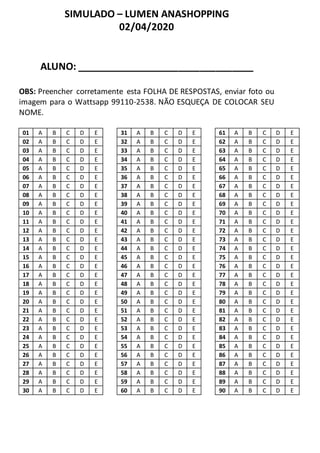 Das Dokument ist ein Antwortblatt für eine simulierte Prüfung, datiert auf den 02.04.2020. Es enthält Platz für die Antworten zu 90 Fragen, die in einem Multiple-Choice-Format strukturiert sind. Der Teilnehmer wird aufgefordert, das Blatt korrekt auszufüllen und ein Foto zur angegebenen WhatsApp-Nummer zu senden.
