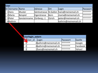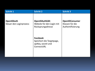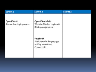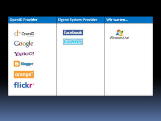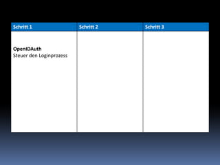 Das Dokument behandelt Sicherheitsaspekte im Umgang mit Benutzerdaten und Authentifizierungsverfahren wie OpenID und Facebook. Es wird auf den Aufwand für die Implementierung von Sicherheitsmaßnahmen und Datenmanagement hingewiesen. Zudem werden verschiedene Fragen zur Identifikation und Verwaltung von Benutzern sowie den Umgang mit Passwortvergessen angesprochen.