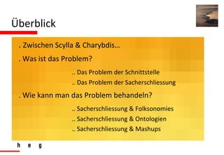 Das Dokument behandelt die Herausforderungen der Sacherschließung als Schnittstellenproblem zwischen Folksonomien und Ontologien im Kontext von Bibliotheken. Es diskutiert verschiedene Ansätze zur Lösung dieser Probleme, darunter die Nutzung von Mashups, die die Kombination und Wiederverwendung von Inhalten aus unterschiedlichen Quellen ermöglichen. Zudem wird die Rolle von Benutzer-generierten Tags und maschinell interpretierbaren Ontologien hervorgehoben.