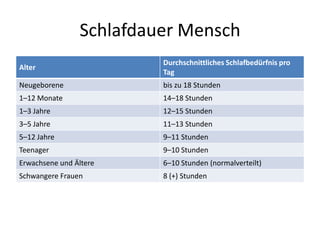 Das Dokument behandelt die Schlafbedarfsprofile verschiedener Altersgruppen und Tiere sowie die Bedeutung des Schlafs für Regeneration, Gedächtnisverarbeitung und Entwicklung. Es beschreibt die Auswirkungen von Schlafmangel und Entzug, die verschiedenen Schlafphasen sowie Methoden des Schlaf-Hackings zur Verbesserung der Schlafqualität. Zudem werden alternative Schlafschedules und Techniken zur Förderung luzider Träume vorgestellt.