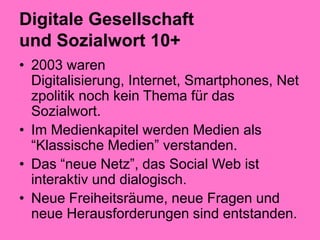 Das Dokument diskutiert die Rolle der Kirchen in einer digital vernetzten Gesellschaft, insbesondere hinsichtlich der Medienarbeit und der Förderung einer aktiven Partizipation. Es betrachtet Herausforderungen wie den Zugang zum Internet, Medienkompetenz und die Schutzrechte von Daten sowie Urheberrechten und schlägt vor, aktuelle soziale und politische Fragen im Kontext der Digitalisierung zu adressieren. Zudem wird die Notwendigkeit eines digitalen Updates des Sozialworts hervorgehoben, um den veränderten Bedingungen gerecht zu werden.