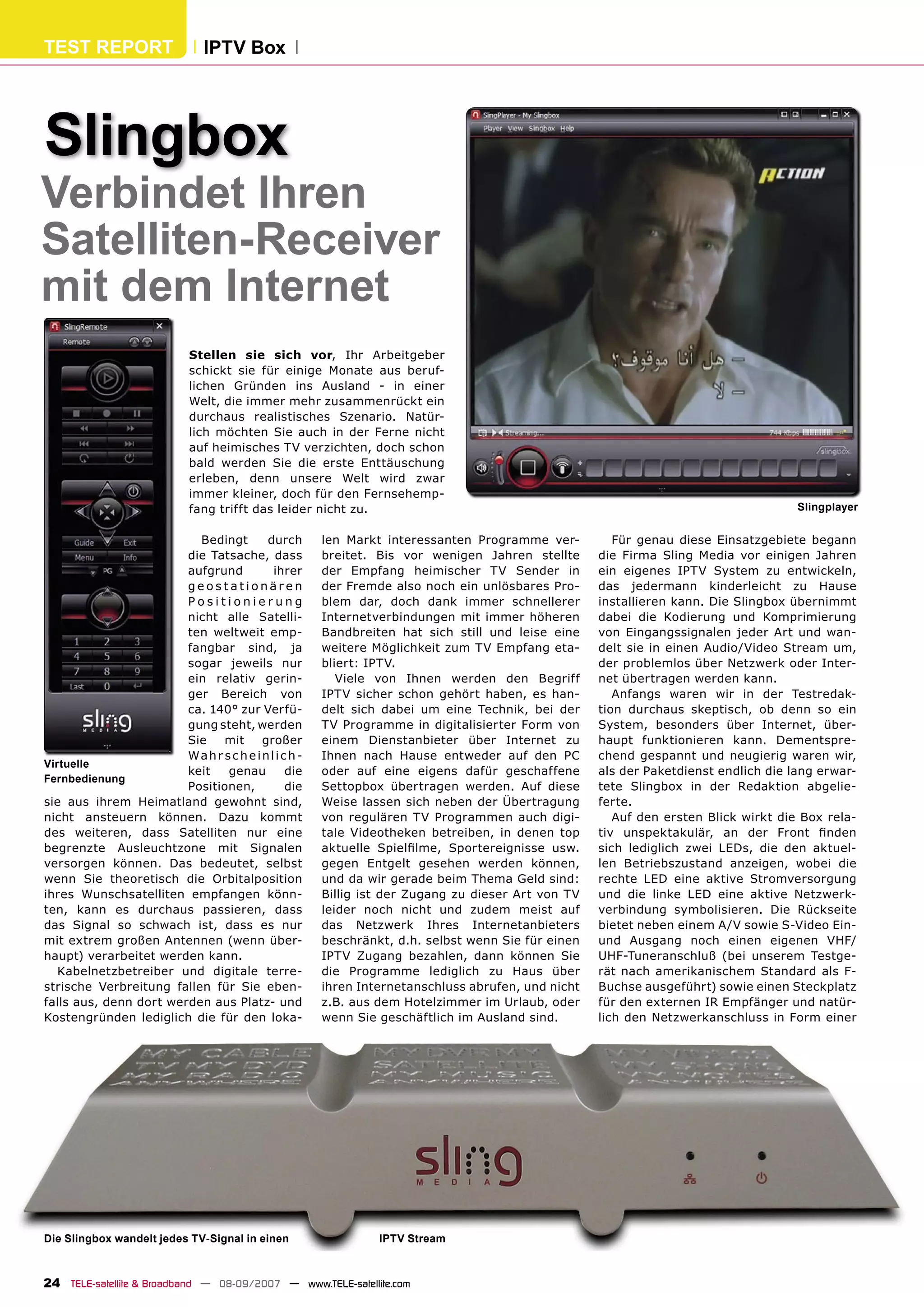 Der Testbericht zur Slingbox beschreibt, wie die Box Fernsehprogramme über das Internet streamt, sodass Nutzer auch im Ausland auf heimische Sender zugreifen können. Die Slingbox verarbeitet verschiedene Signalarten und ermöglicht die Nutzung über eine Software, die die Steuerung des Empfangsgeräts von der Ferne aus unterstützt. Insgesamt zeigt der Test positive Ergebnisse hinsichtlich der Bildqualität und der Nutzerfreundlichkeit, wobei es Anmerkungen zur Bandbreite und den Einschränkungen bei der Nutzung über mobile Geräte gibt.