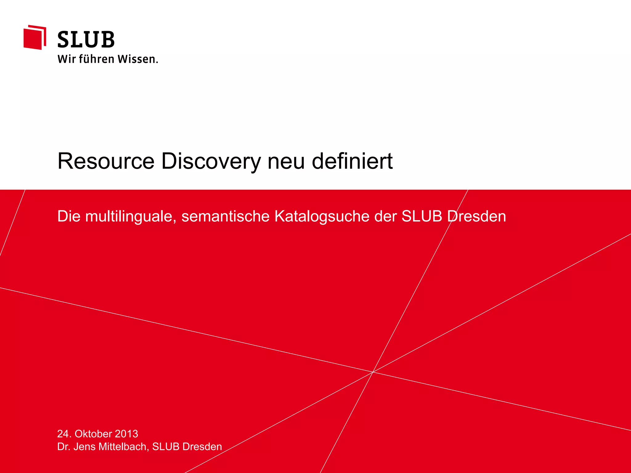 Das Dokument beschreibt die Neudefinition der multilinguale und semantische Katalogsuche der SLUB Dresden im Rahmen des Konzeptes 'Resource Discovery', das eine integrierte Suche und den Zugang zu verschiedenen Ressourcendaten ermöglichen soll. Es werden Herausforderungen und Lösungen diskutiert, einschließlich der Entwicklung der SLUBSemantics-Plattform, die auf Wikipedia-Daten basiert, um bibliografische Daten anzureichern und so die Suche zu verbessern. Darüber hinaus wird die Rolle von Bibliotheken im digitalen Zeitalter als Anbieter von bequemen Dienstleistungen und nicht nur als Zugangspunkte zu Informationen hervorgehoben.
