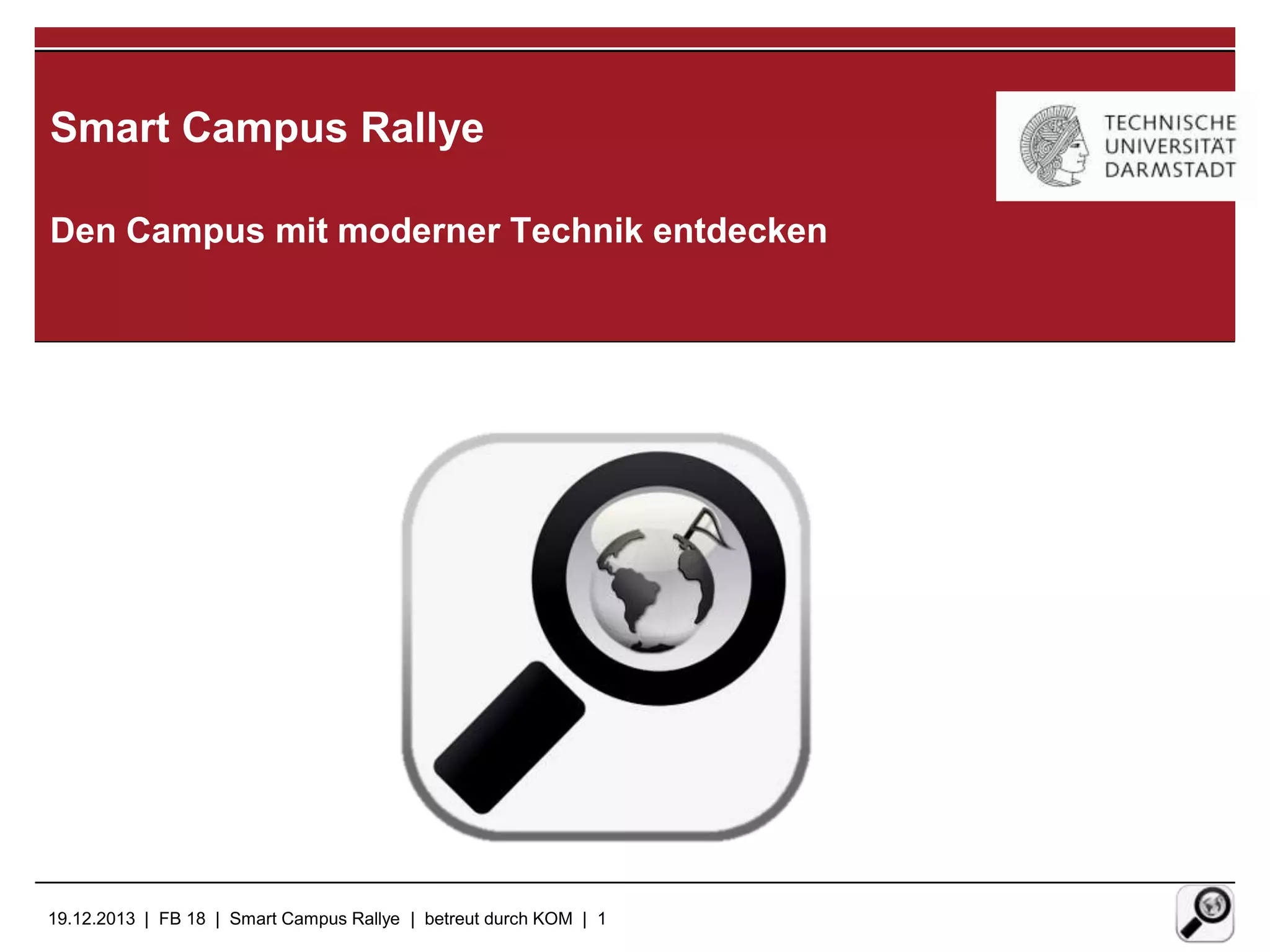 Die Smart Campus Rallye nutzt moderne Technologie zur Erkundung des Campus und umfasst eine Android-App für Echtzeitinformationen sowie ein Managementsystem auf WordPress-Basis. Die Teilnehmer arbeiten in Gruppen, lösen Aufgaben an verschiedenen Stationen und erfassen ihre Punkte über RFID-Technologie. Das Projekt fördert die Zusammenarbeit zwischen den Gruppen und die enge Zusammenarbeit mit Betreuern und Studenten.