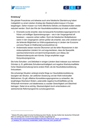 Das IW Policy Paper erörtert die Herausforderungen der Haushaltskonsolidierung in Europa nach der Finanzkrise und empfiehlt, dass Ausgabenkürzungen Vorrang vor Steuererhöhungen haben sollten, um langfristiges Wachstum zu fördern und soziale Gerechtigkeit zu gewährleisten. Es werden verschiedene Maßnahmen vorgestellt, darunter Reformen im Renten- und Gesundheitswesen, Privatisierungen sowie die Aufrechterhaltung öffentlicher Investitionen, die alle zur Reduzierung von Defiziten und zur Förderung von Wachstum beitragen sollen. Die Bedeutung von Glaubwürdigkeit und sorgfältiger Kommunikation seitens der Regierungen wird ebenfalls hervorgehoben, um das Vertrauen der Märkte zurückzugewinnen.