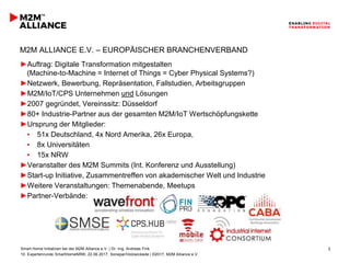 Die M2M Alliance e.V. fördert die digitale Transformation im Bereich Internet of Things (IoT) und bietet ein Netzwerk von über 80 Industriepartnern, die diverse Lösungen für M2M und IoT entwickeln. Die Initiative zielt darauf ab, Smart Home-Lösungen zu verbreiten, sieht jedoch Herausforderungen wie Sicherheitsbedenken, technische Komplexität und das Fehlen einheitlicher Standards. Zukünftig wird ein verstärkter Fokus auf Sicherheit und die Entwicklung standardisierter Protokolle gefordert, um die Akzeptanz und Integration von Smart Home-Technologien zu verbessern.