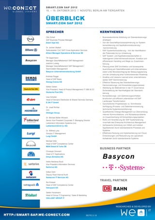 Die Konferenz smart.con SAP 2012, die am 18. und 19. Oktober in Berlin stattfand, fokussierte sich auf die Konsolidierung von System- und Applikationslandschaften sowie die Harmonisierung von Daten und Geschäftsprozessen. Experten aus verschiedenen Unternehmen präsentierten Fallstudien und Strategien zur Optimierung von SAP-Prozessen, einschließlich Änderungen in der Systemarchitektur und effektiven Projektansätzen zur Überwindung interner Herausforderungen. Die Veranstaltung beinhaltete auch Networking-Möglichkeiten und interaktive Diskussionsformate zur Förderung des Austauschs zwischen den Teilnehmern.