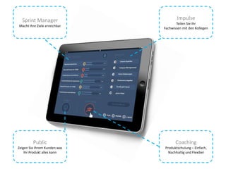 Der Sprint Manager von Smartforce.pro ermöglicht es Unternehmen, klare Ziele für Mitarbeiter zu definieren und deren Fortschritt in Echtzeit zu verfolgen. Das System bietet auch eine Plattform für E-Learning und Wissensaustausch, sodass Schulungen flexibel und nachhaltig durchgeführt werden können. Darüber hinaus können individuelle Kurse erstellt und aktuelle Informationen für Kunden leicht präsentiert werden.