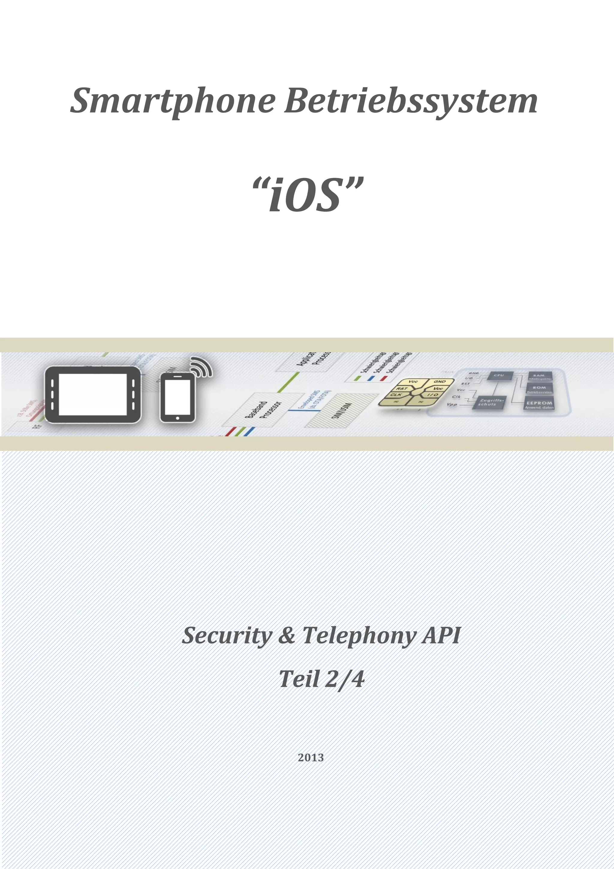 Das Dokument behandelt die Sicherheitsaspekte des iOS-Betriebssystems und die Telephony API im Kontext von Smartphones. Es beschreibt die Fragmentierung der Betriebssysteme, die Eigenentwicklung von iOS sowie die eingeschränkten Entwicklungs- und Programmiermöglichkeiten im geschlossenen System. Zudem wird das Core Telephony Framework erläutert, welches den Zugriff auf Modem und SIM-Karte ermöglicht und Methoden zur Abwehr von Angriffen aufzeigt.
