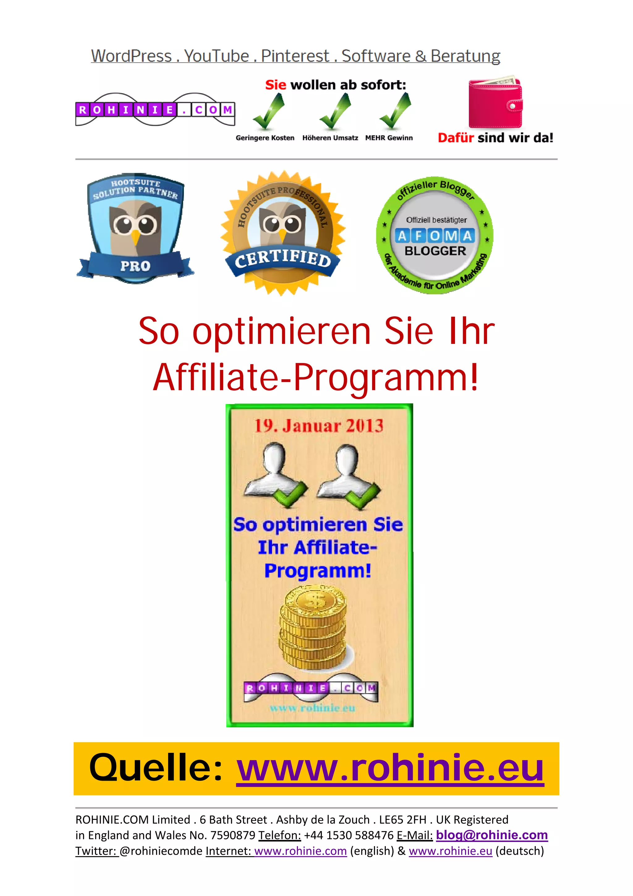 Das Dokument bietet zehn Tipps zur Optimierung eines Affiliate-Programms, um die Reichweite und den Umsatz zu steigern. Dazu gehören die Förderung von Partnerschaftsbeziehungen, die Bereitstellung von Materialien, das Angebot attraktiver Provisionen und die Unterstützung durch einen Affiliate-Manager. Ein gut strukturiertes Affiliate-Programm kann helfen, diverse Zielgruppen zu erreichen und Umsatzziele zu erfüllen.