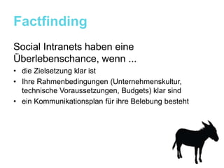 Der Workshop zur Analyse und Konzeption von sozialen Intranets fokussiert auf klare Zielsetzungen, Rahmenbedingungen und Kommunikationspläne, um eine erfolgreiche Implementierung sicherzustellen. Teilnehmer lernen, wie sie die spezifischen Anforderungen ihres Unternehmens berücksichtigen können, um informierte Entscheidungen zu treffen und die Nutzer einzubeziehen. Es wird betont, dass interne Kommunikationsprojekte Verbündete benötigen und dass die Werkzeuge die Vision unterstützen sollten.