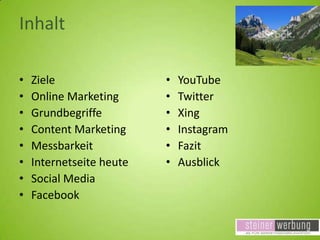 Das Dokument bietet einen umfassenden Überblick über Social Media und Online-Marketing, einschließlich der grundlegenden Begriffe, Strategien und Ziele, um die Kommunikation zu optimieren und die Sichtbarkeit zu erhöhen. Es diskutiert die Bedeutung der Messbarkeit von Marketingmaßnahmen und gibt praktische Tipps zur Nutzung verschiedener Plattformen wie Facebook, YouTube, Twitter und Instagram. Abschließend werden Empfehlungen für Einsteiger und Fortgeschrittene gegeben, um eine zielgerichtete und effektive Nutzung von Social Media zu gewährleisten.